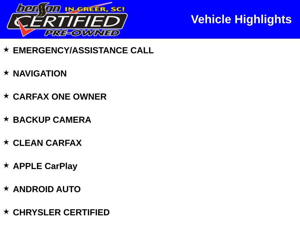 PRICED BELOW J.D.POWER RETAIL PRICE OF $33,775. EMERGENCY/ASSISTANCE CALL, NAVIGATION, CARFAX ONE OWNER, BACKUP CAMERA, CLEAN CARFAX, APPLE CarPlay, ANDROID AUTO, CHRYSLER CERTIFIED, **REMAINDER OF FACTORY WARRANTY**, LOW MILES, UPGRADE WHEEL PACKAGE, 3.45 Rear Axle Ratio. Certified.