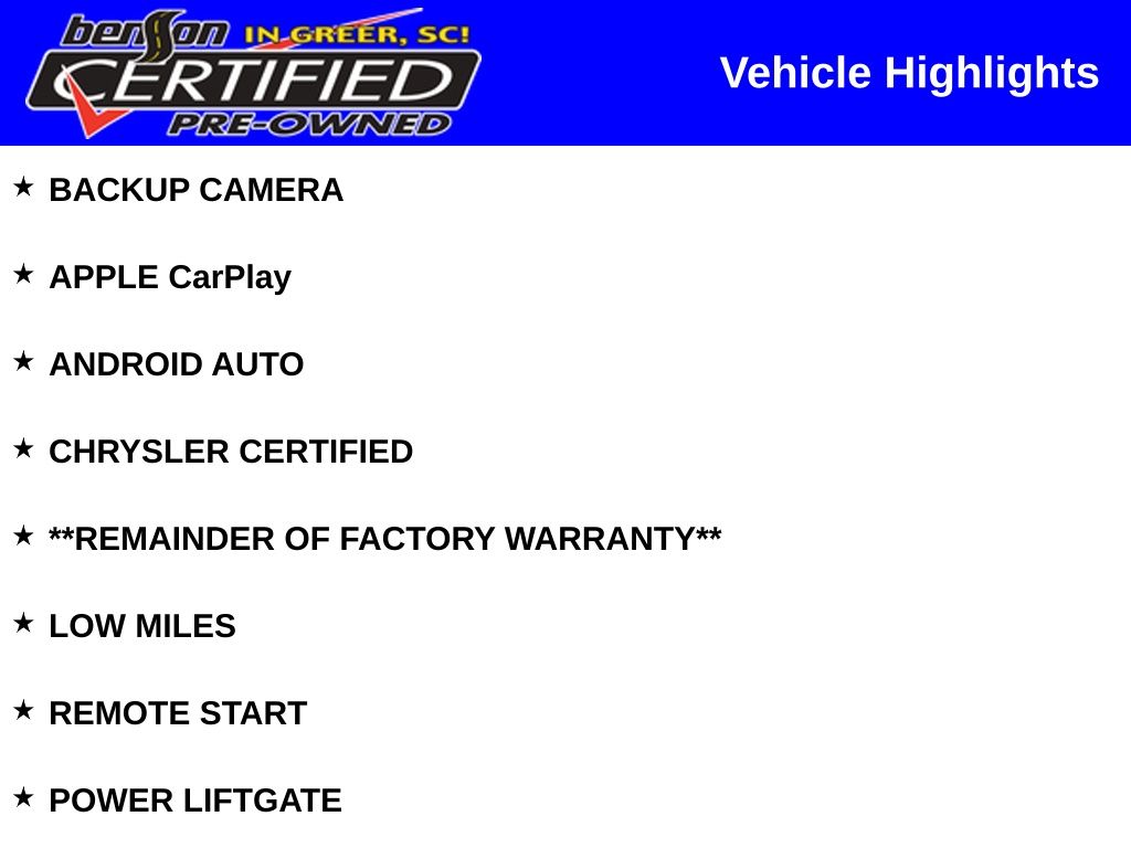 BLIND SPOT AND CROSS PATH DETECTION, LANE MANAGEMENT, FORWARD COLLISION WARNING, PEDESTRIAN DETECTION, ADAPTIVE CRUISE CONTROL, NAVIGATION, PANORAMIC SUNROOF, HEATED FR & RR SEATS, BACKUP CAMERA, APPLE CarPlay, ANDROID AUTO, CHRYSLER CERTIFIED, **REMAINDER OF FACTORY WARRANTY**, LOW MILES, REMOTE START, POWER LIFTGATE, 4WD. Certified.