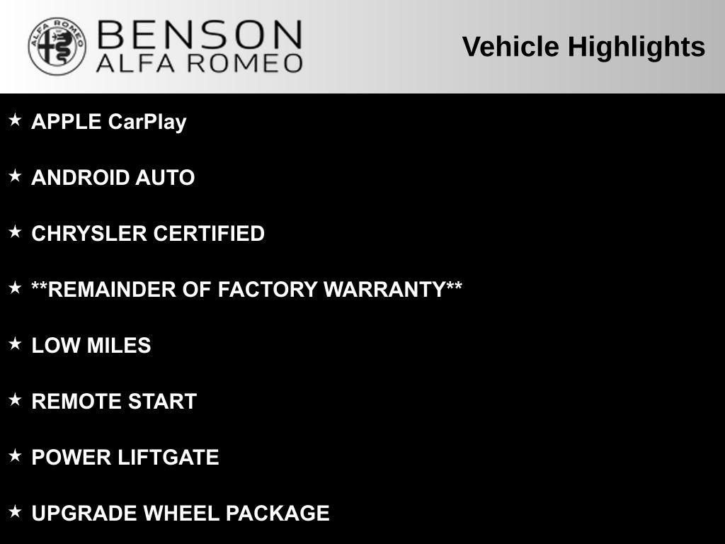 BLIND SPOT AND CROSS PATH DETECTION, FORWARD COLLISION WARNING, PEDESTRIAN DETECTION, ADAPTIVE CRUISE CONTROL, NAVIGATION, PANORAMIC SUNROOF, HEATED FR & RR SEATS, BACKUP CAMERA, APPLE CarPlay, ANDROID AUTO, CHRYSLER CERTIFIED, **REMAINDER OF FACTORY WARRANTY**, LOW MILES, REMOTE START, POWER LIFTGATE, UPGRADE WHEEL PACKAGE, 4WD. Certified.