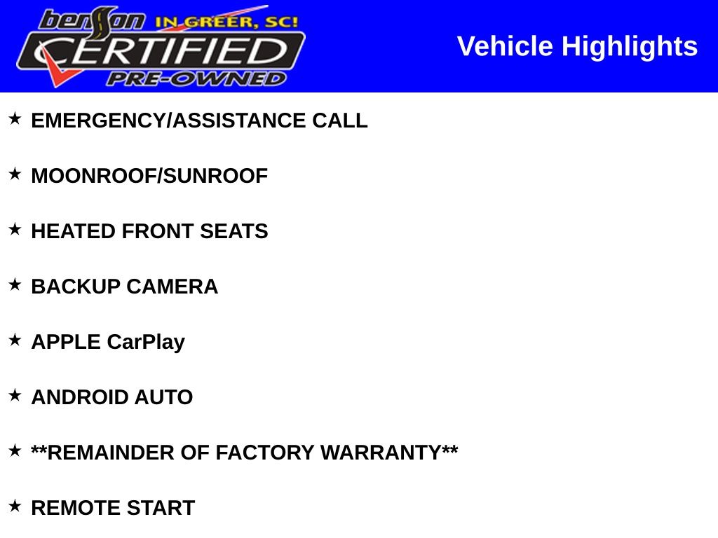 PRICED BELOW J.D.POWER RETAIL PRICE OF $47,000. EMERGENCY/ASSISTANCE CALL, MOONROOF/SUNROOF, HEATED FRONT SEATS, BACKUP CAMERA, APPLE CarPlay, ANDROID AUTO, **REMAINDER OF FACTORY WARRANTY**, REMOTE START.